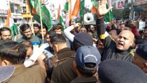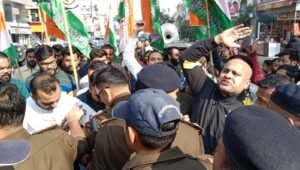 पुलिस की रोक-टोक के बाद कार्यकर्ता सड़क पर बैठ गए और नारेबाजी करते हुए प्रदर्शन शुरू कर दिया। इस दौरान पुलिस और कार्यकर्ताओं के बीच धक्का-मुक्की भी हुई।