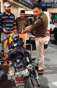 चेकिंग के दौरान एक बुलेट बाइक सवार खतरनाक स्टंट करते हुए साइलेंसर से पटाखों जैसी तेज आवाज निकाल रहा था, जिससे राहगीरों में अफरा-तफरी मच गई।.पुलिस ने मोटरसाइकिल UK08 AW 0438 को मौके पर ही MV Act में सीज कर दिया।