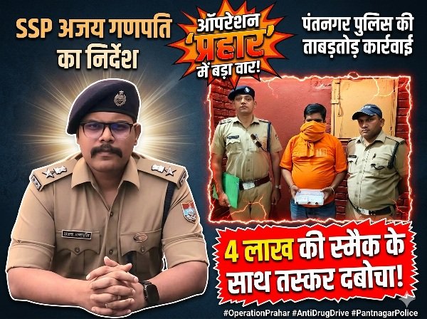 उधमसिंहनगर: नशा तस्करों के खिलाफ पुलिस का शिकंजा लगातार कसता जा रहा है। “ऑपरेशन प्रहार” के तहत पंतनगर पुलिस ने बड़ी कार्रवाई करते हुए एक शातिर नशा तस्कर को गिरफ्तार कर उसके कब्जे से करीब 4 लाख रुपये से अधिक कीमत की स्मैक बरामद की है। इस कार्रवाई से नशा कारोबारियों में हड़कंप मच गया है।