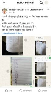 पुलिस की कार्रवाई….पुलिस ने इस मामले में बॉबी पंवार समेत सभी आरोपियों के खिलाफ उत्तराखंड प्रतियोगी परीक्षा (भर्ती में अनुचित साधनों की रोकथाम एवं निवारण) अध्यादेश 2023 के तहत मुकदमा दर्ज किया है। SIT अब उन छात्रों और अन्य लोगों की भी पहचान कर रही है जिनसे आरोपियों का संपर्क रहा है।